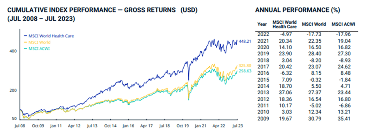 全球對醫療保健服務的需求持續及穩定增長,在市場低迷期間,支持著醫療保健行業的恢復。在2022年更為明顯,MSCI World Health Care Index為-5.4%,而MSCI World Index則下跌 -17.7%。此外,2023年1月至7月期間,MSCI World Index已上漲19.34%,而MSCI World Health Care Index則溫和增長2.43%。儘管如此,值得留意的是,醫療保健行業也正在經歷顯著擴張,為投資者提供了一個多元化回報的潛在途徑。