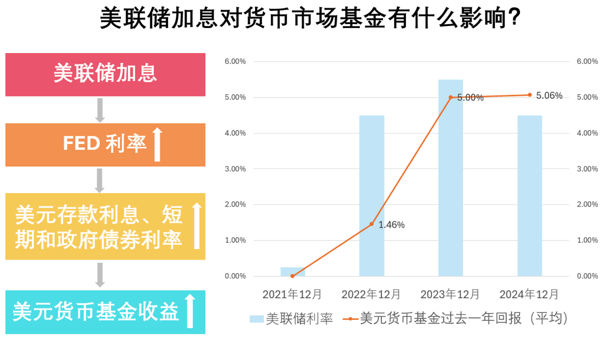 以美元货币基金为例,美元货币基金的利率原则上紧贴FED利率。美联储加息,意味美国银行里的存款、存单利息都会升高,同时,可能会有更多资金流入从长期固定收益资产转移到短期固定收益资产,因此投资于银行存款、存单的美元货币基金,收益自然「水涨船高」,成为加息最直接受惠的收益产品之一。