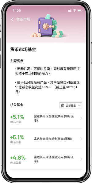 1.以美元货币基金为例,数据截至2024年12月31日,在香港零售基金市场中,计算所有美元货币基金过去一年回报的平均值。资料由基金公司、Morningstar Asia Limited提供。