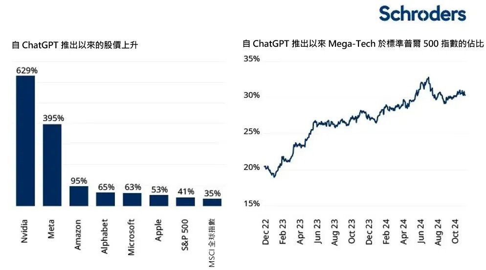 资料来源:施罗德投资、彭博社,截至2024年11月18日收市。注意:ChatGPT於2022年11月推出。任何关于地区/国家/行业/股票/证券的引用仅为说明用途,并非购买或出售任何金融工具或采用特定投资策略的建议。