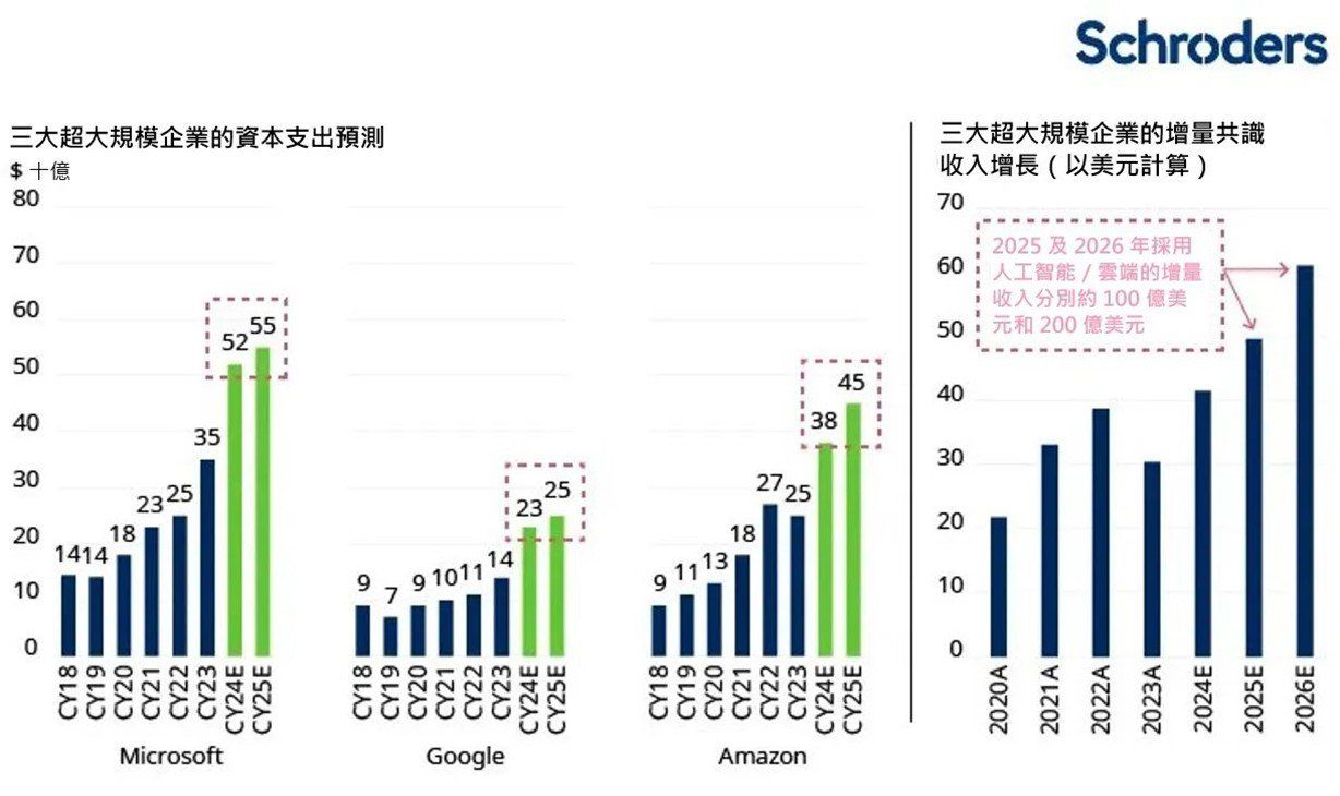 资料来源:图了–高盛,公司数据截至2024年7月15日。超大规模企业包括Amazon、Microsoft、Google。Amazon资本支出是特定於AWS的GSe,Google资本支出是伺服器和网路设备的GSe,而Microsoft资本支出是合并的。资料来源:图右–巴克莱研究、彭博资讯共识、截至2024年6月25日的公司档案。任何对地区/国家/行业/股票/证券的引用为说明用途,并非购买或出售任何金融工具或采用特定投资策略的建议。