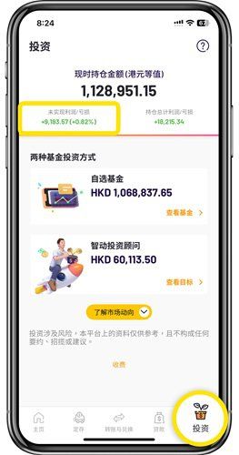 - 「未实现利润/亏损」数据,你可以查看你持有的自选基金(包括汇立闲智宝),智动投资顾问组合的「未实现利润/亏损」港元等值金额以及百分比,掌握最新投资表现。