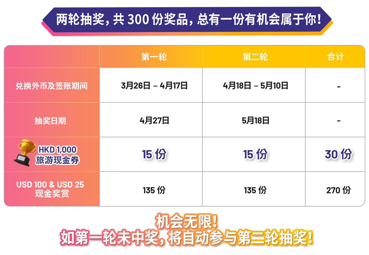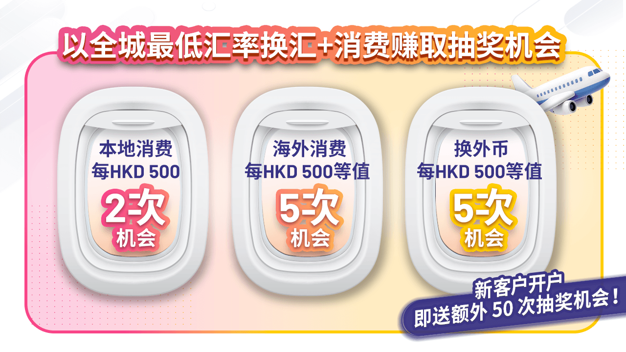 换汇+签账随时赢 HKD 1,000 旅游现金券