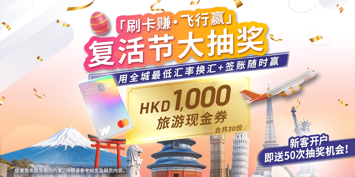 复活节旅行从订机票到刷卡扫货,用汇立全城最低汇率1・成本价2换好外币,再用汇立寰球钱包借记卡签账享 $0 外币交易手续费3,4 月 1 日起海外签账享高达 3% 现金回赠4。每笔消费都帮你赚到尽,还有「刷卡赚・飞享赏・复活节大抽奖」,随时赢取 HKD 1,000 旅游现金券5!🎰
