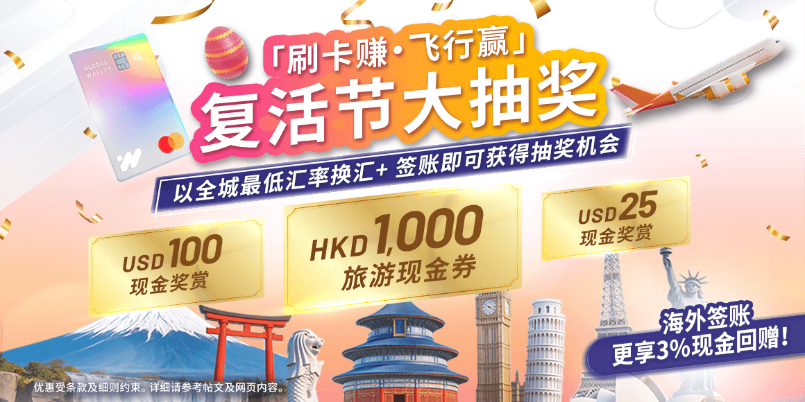无论出行、游玩、还是扫货,出发前用汇立全城最低汇率¹・成本价²换好外币,再用汇立寰球钱包借记卡签账享$0外币交易手续费³及高达3%海外签账现金回赠⁴。每一笔消费都让你赚更多,还有「刷卡赚・飞享赏・复活节大抽奖」,随时赢取HKD1,000 旅游现金券⁵,总共300份丰富奖赏等着你!🎰