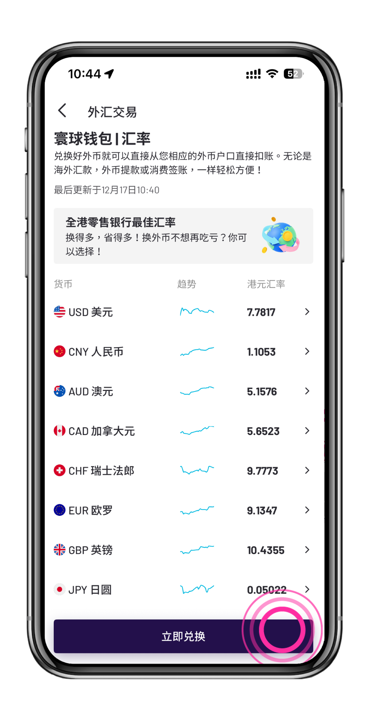 客户透过汇立银行 App 的「外汇交易」功能于单一交易以100,000 港元或以上成功兑换合资格外币⁶,在完成该交易后的5分钟内,找到第三方银行报价⁷,而根据该报价,你可以用更少港元兑换至合资格外汇交易相同的外币金额⁶,我们将退还差额⁴。