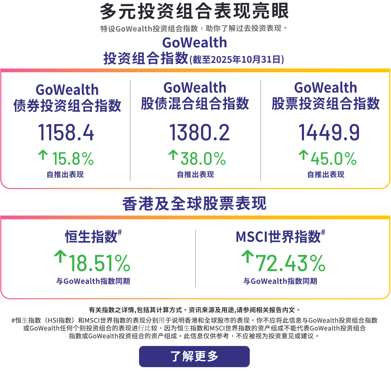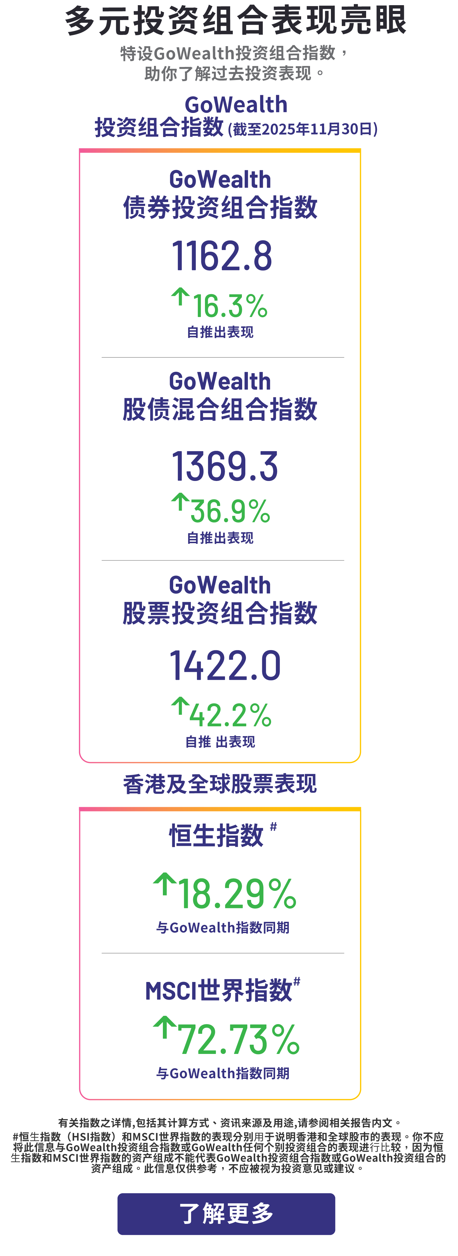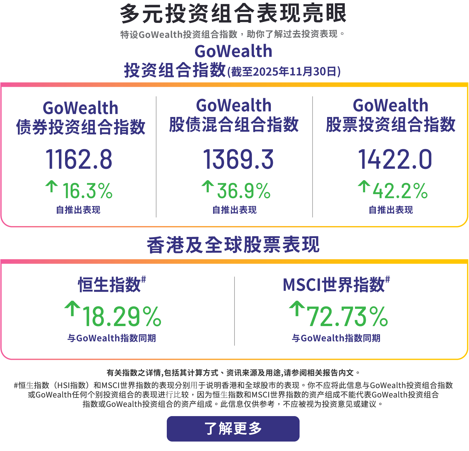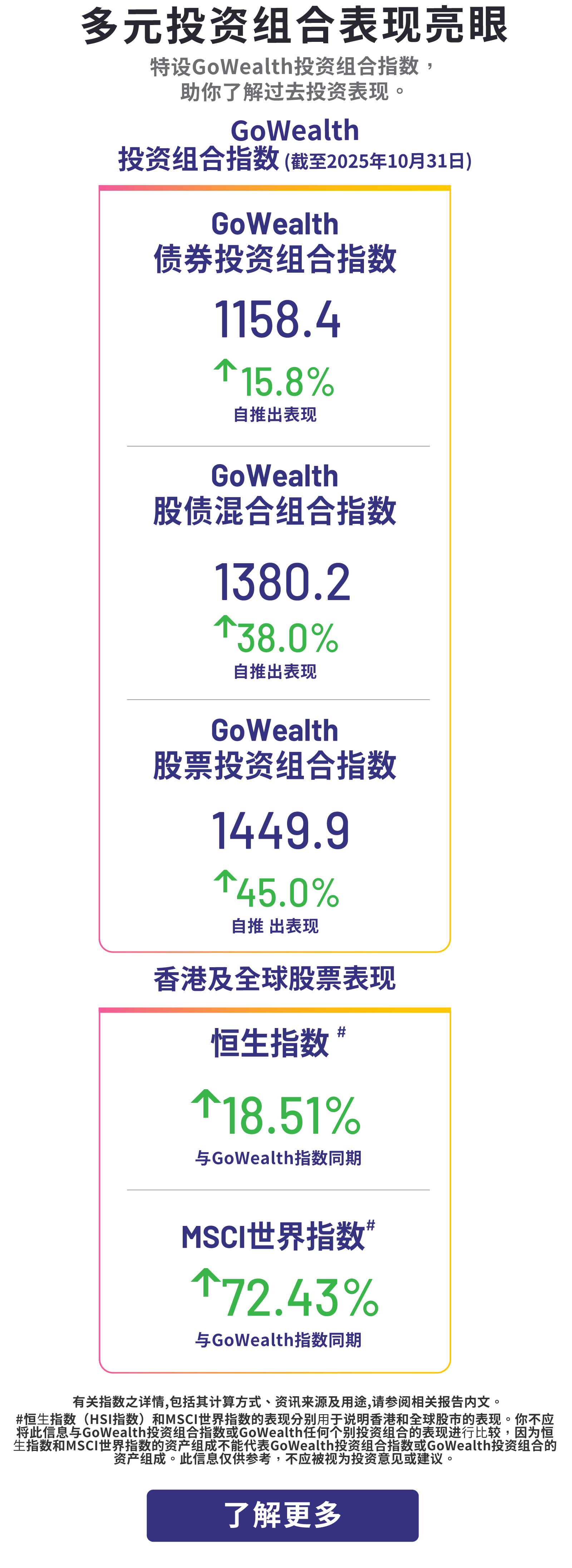 注意: 我们分别就智动投资顾问的债券组合、股债混合组合及股票组合制定智动投资顾问投资组合指数,用以反映智动投资顾问投资组合自推出以来之投资表现。 指数仅供参考,且不构成任何投资产品或服务的要约、招揽、建议、意见或任何保证。 投资涉及风险。 过往业绩并不代表将来表现,你不应视指数为未来表现之预测或保证。