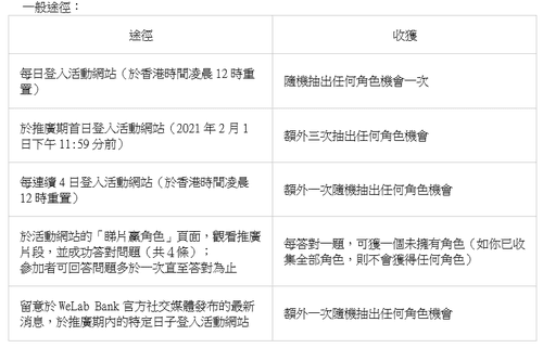 [6] 當你於活動網站成功登記後,你的目標為收集全部18個不同角色,以有機會獲得現金獎賞(「獎賞」),跟據活動指示你有機會得到獎賞。為免生疑問,如果你不是WeLab Bank的新客戶或現有客戶,你只合資格參與本活動,而將不會獲得任何迎新獎賞或加入大抽獎。詳情如下表所示: