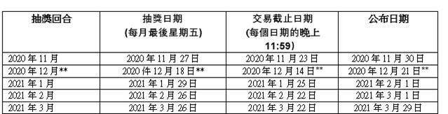 [13]由2021年1月至2021年3月期間,我們將在以下的抽獎日期每月(每輪)抽出多達16名得獎者。除特別註明外,否則得獎者將在以下日期公布: