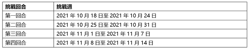 [3] 挑戰週將有 4 次回合(「回合」),每回合持續 7日(「挑戰週」)如下。 我們保留隨時自行決定更改挑戰週的權利。