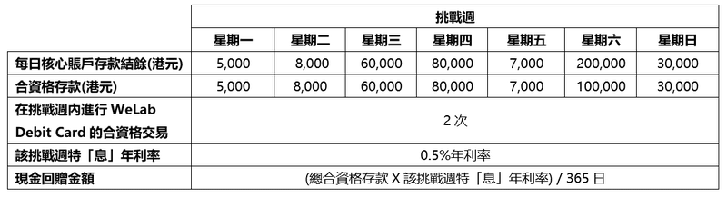 (a) 如果你挑戰週內於核心賬戶中的每日存款餘額為 5,000港元或以上並在挑戰週內進行了 2 次WeLab Debit Card合資格交易,你將有權於該挑戰週獲享特「息」0.5% 年利率。