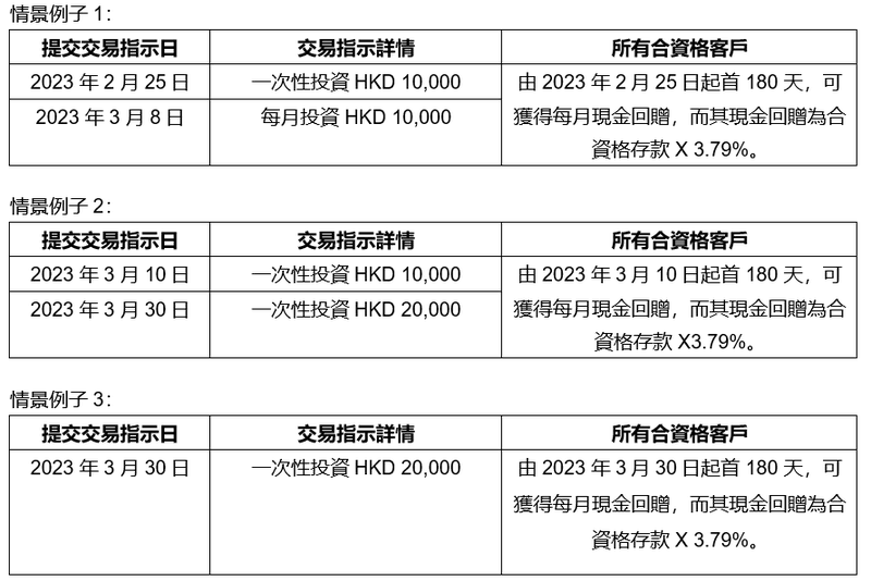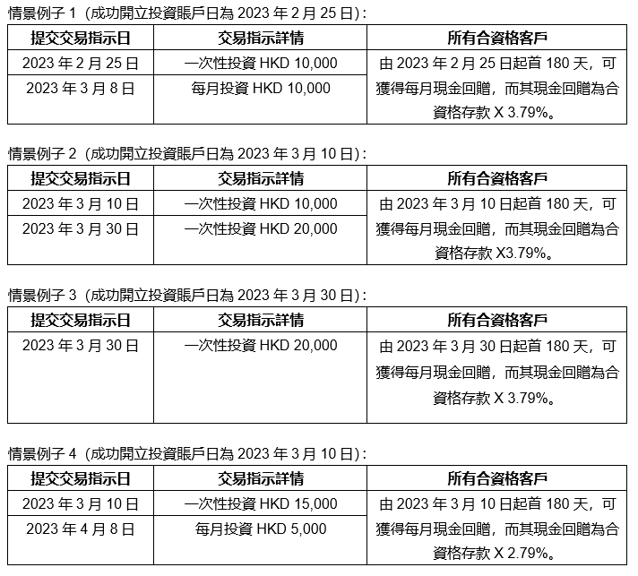 (c) 如你在計劃期內於投資賬戶中成功提交累計不少於HKD 20,000 (或等值)的一次性投資交易指示及/或每月投資交易指示,以認購基金,你將可獲得除現金回贈年利率外的1%的額外回贈獎賞率。