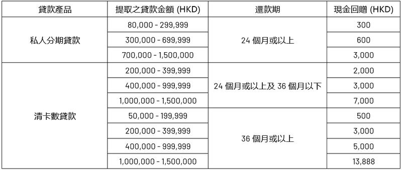 [2] 客户(「你」或「你的」)于推广期内成功根据WeLab Bank私人贷款(私人分期贷款及清卡数贷款)贷款条款及细则(「贷款」)于汇立银行有限公司(「WeLab Bank」 丶「本行」或「我们」)申请贷款并于批核成功后的 7 日内提取贷款 (不适用于再借/加借私人贷款)及选择 24 个月或以上还款期,可享 高达 HKD 13,888 现金回赠(「现金回赠」),你可获享之现金回赠之详情 如下: