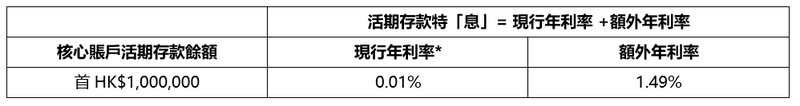 [3] 新客戶於核心賬戶中的合資格活期存款在成功開立賬戶日起首90天可獲得特「息」合共年利率1.5%。