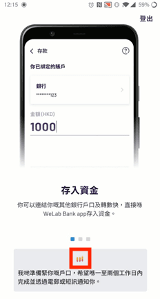 a) 經過橙色流動棒重新載入WeLab Bank app的頁面,表示你的賬戶正在準備中(「成功提交頁面」)(請參考條款一的成功提交頁面例子);或