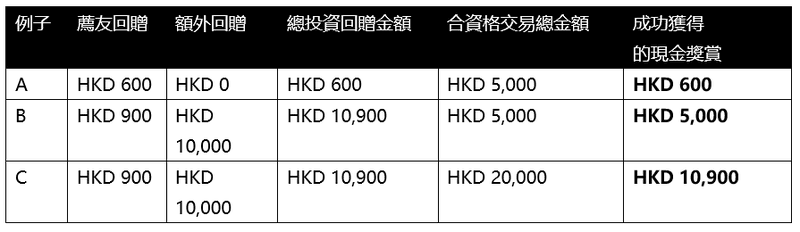 [4] 合資格客戶(「推薦人」或「你」)可於每次成功推薦後獲得HKD 300 投資回贈(「薦友回贈」)。「成功推薦」即代表於推廣期內完成下列任務:
