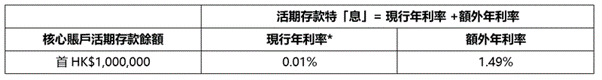 [4] 新客戶於核心賬戶中的合資格活期存款在成功開立賬戶日起首90天可獲得特「息」合共年利率1.5%。