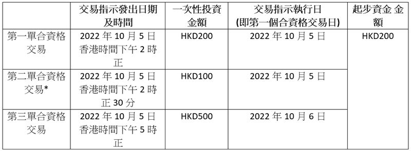 [5] 起步資金金額將等於所有在第一個合資格交易日內進行的合資格交易當中最高一次性投資之金額(「起步資金認購交易」) ,上限為HKD300。「第一個合資格交易日」為你於推廣期內,第一單成功執行的合資格交易之交易日。
