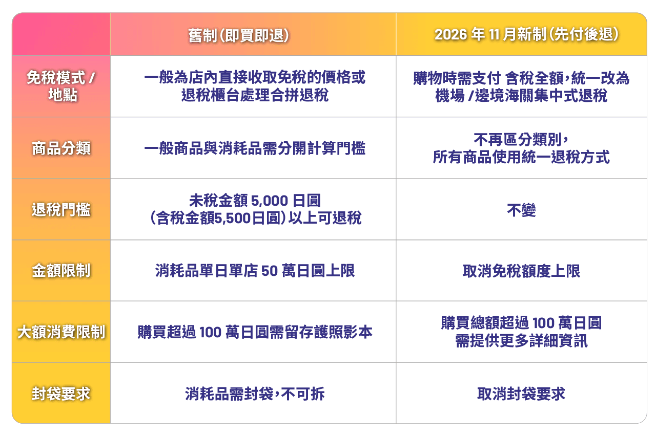 但近年日本政府為咗防止有人大量購買免稅商品但係冇帶出境,預計由 2026年11月1日起就會全面實施「先付後退」新制。