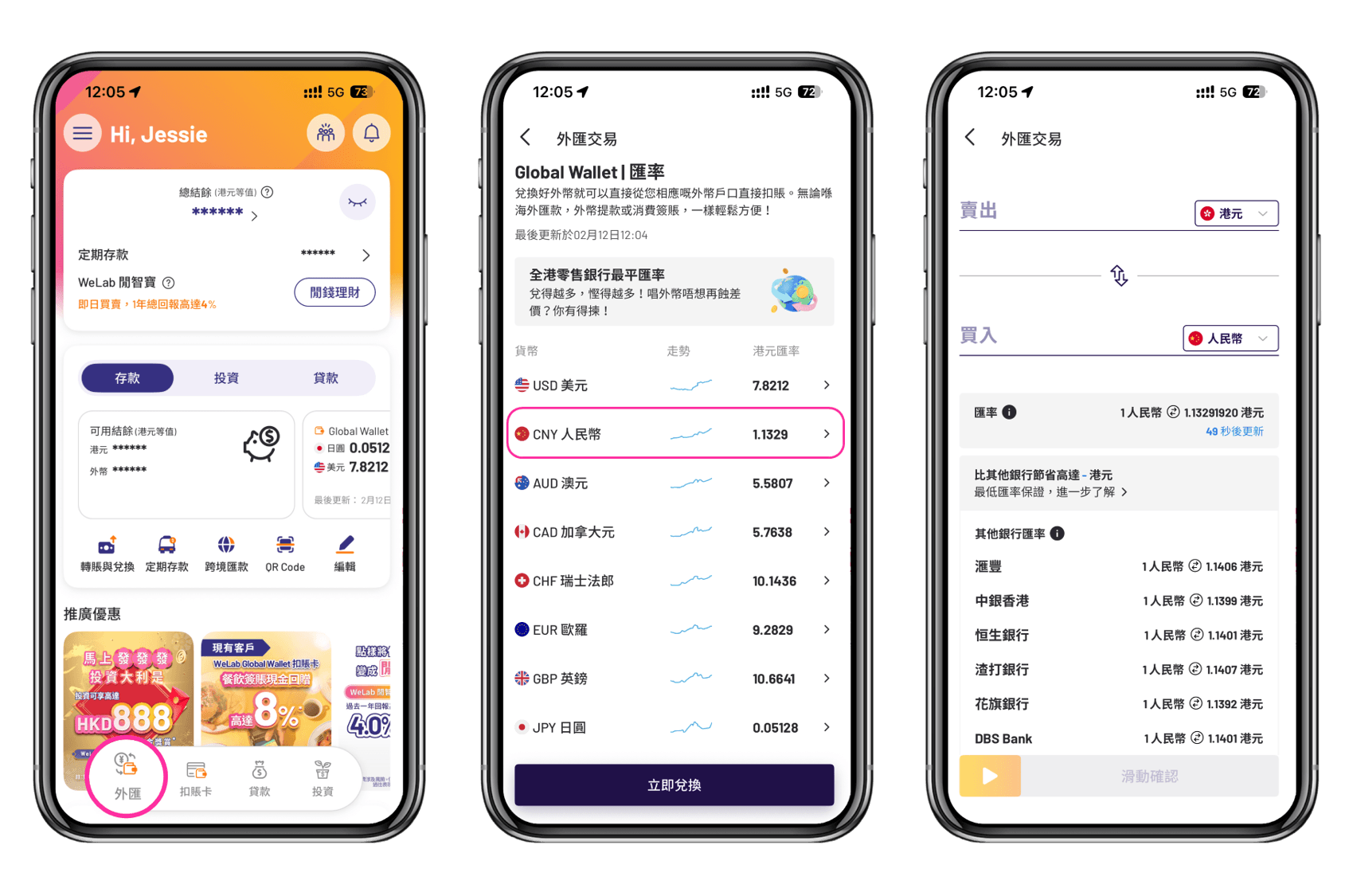 ✨扣賬卡鎖定匯率技巧:你可以隨時使用WeLab Bank App 「兌換外幣」功能,App 內可以見到匯率最近趨勢,3步完成兌換人民幣⁴ — 真正做到「先唱錢、後著數 」!