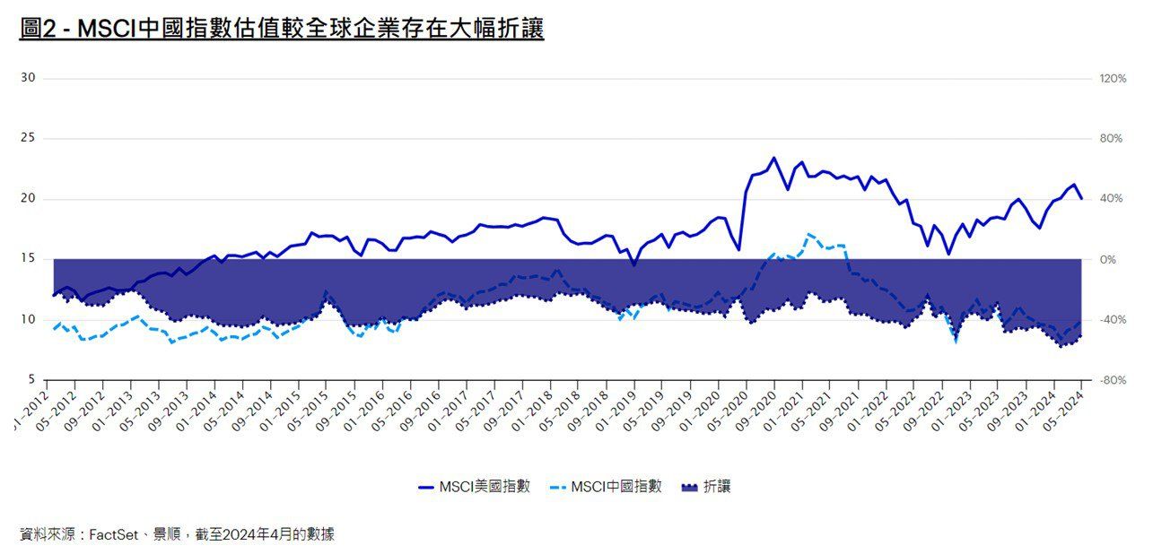 目前,不論就歷史水平而言或是與已發展市場相比,中國股市估值均處於較低水平。實際上,MSCI中國指數現較MSCI美國指數大幅折讓約50%。我們相信,這對投資者而言是一個極具吸引力的趁低吸納機會。