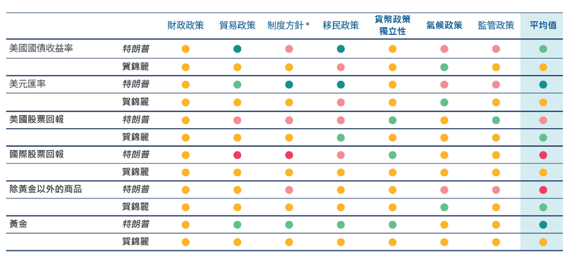 圖表 1:我們預期兩位主要候選人的政策所帶來的市場反應(基於政府分化下的12個月投資年期)