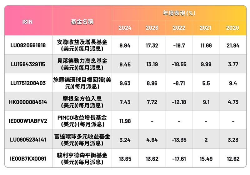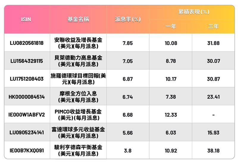 *「派息之選」基金主題」以一年回報表現排序,列出WeLab Bank所代理之所有「派息之選」基金主題(美元股份類別),ISIN、 基金回報表現等資料由 Morningstar Asia Limited所提供,資料截至2025年8月31日。我們不會對資料的準確性負責或認可。投資涉及風險。過往表現並非將來指標。資料 僅供一般參考,不構成任何招攬、推薦或建議。