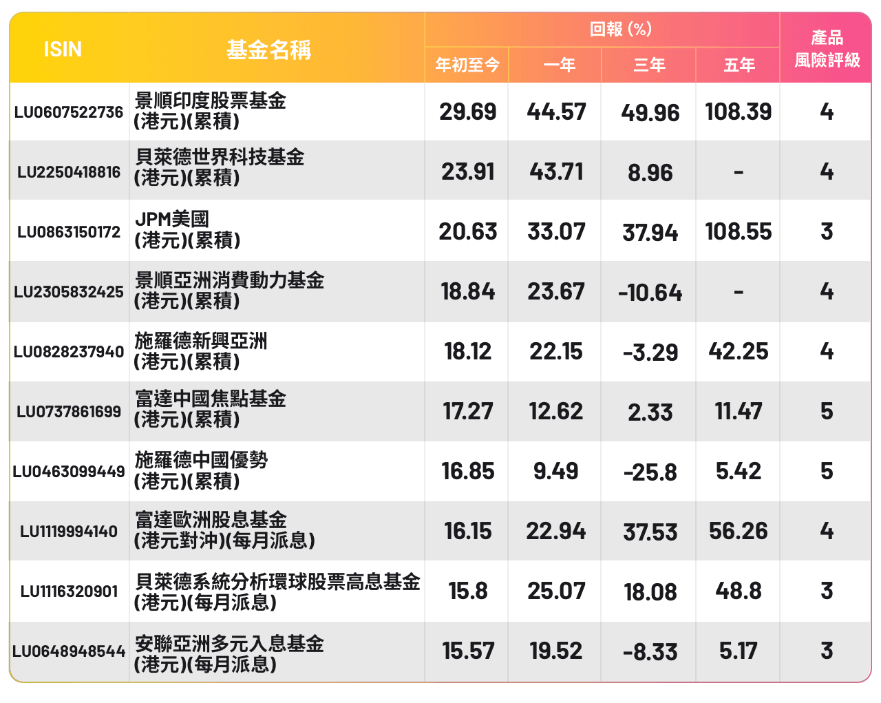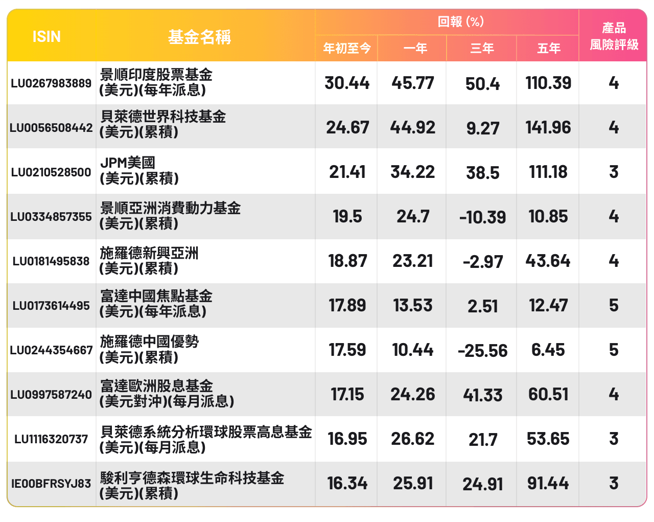 我哋銷售嘅基金中年初至今表現最佳的十隻基金(美元/港元)包括: