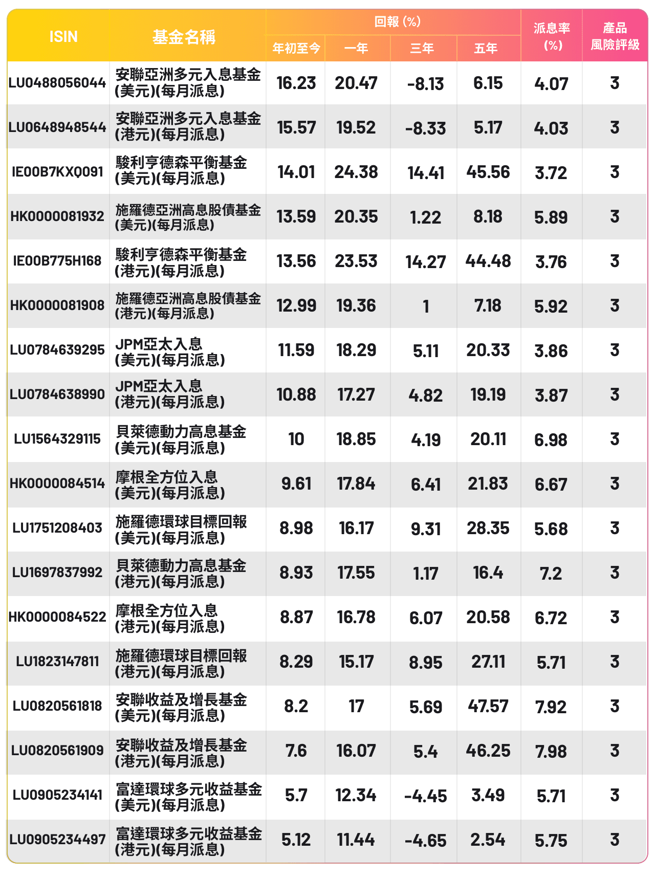 資料來源:ISIN、基金回報表現等資料由 Morningstar Asia Limited 所提供,資料截至 2024 年 9月 30 日。派息率為年化數值,息率並不保證,派息可從資本中支付。我們不會對資料的準確性負責或認可。過往表現並非將來指標。更多基金表現之詳情請參閱基金銷售文件。完整基金清單請參閱WeLab Bank APP或網站。