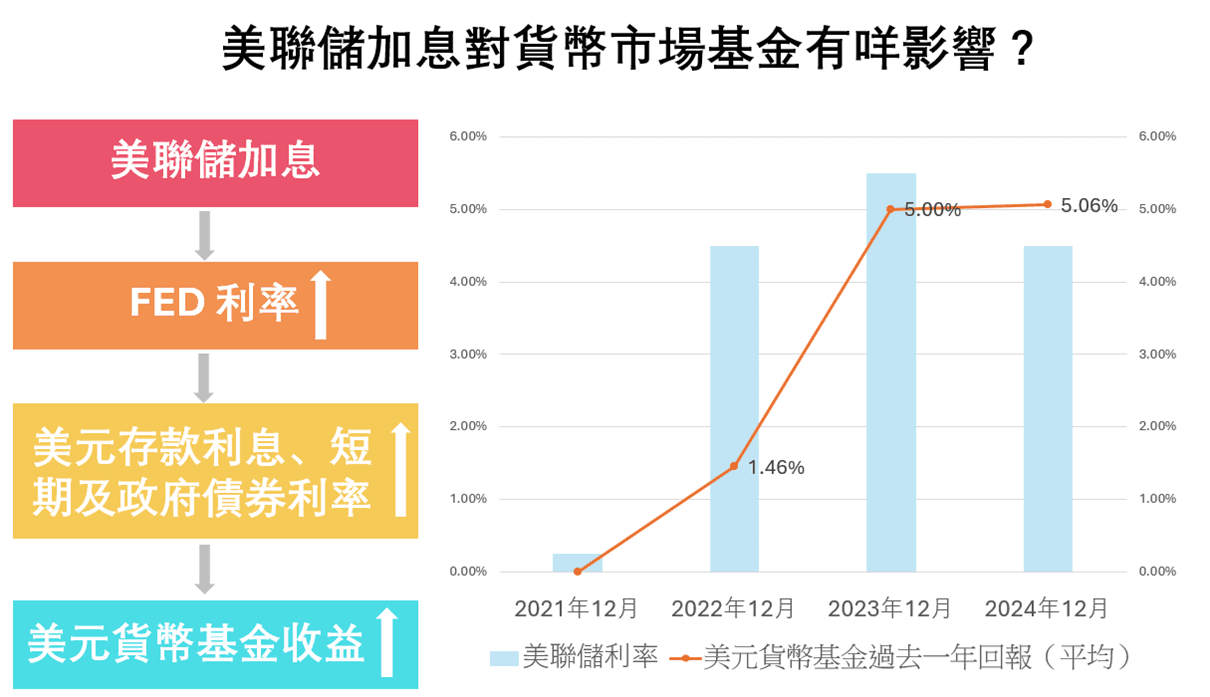 以美元貨幣基金為例,美元貨幣基金嘅利率原則上緊貼 FED 利率。美聯儲加息,意味美國銀行入面嘅存款、存單利息都會升高,同時,可能會有更多資金流入由長期固定收益資產轉移到短期固定收益資產,因此投資於銀行存款、存單嘅美元貨幣基金,收益自然「水漲船高」,成為加息最直接受惠嘅收益產品之一。