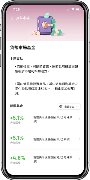 - 以美元貨幣基金為例,數據截至2024年12月31日,在香港零售基金市場中,計算所有美元貨幣基金過去一年回報嘅平均值。資料由基金公司、Morningstar Asia Limited提供。