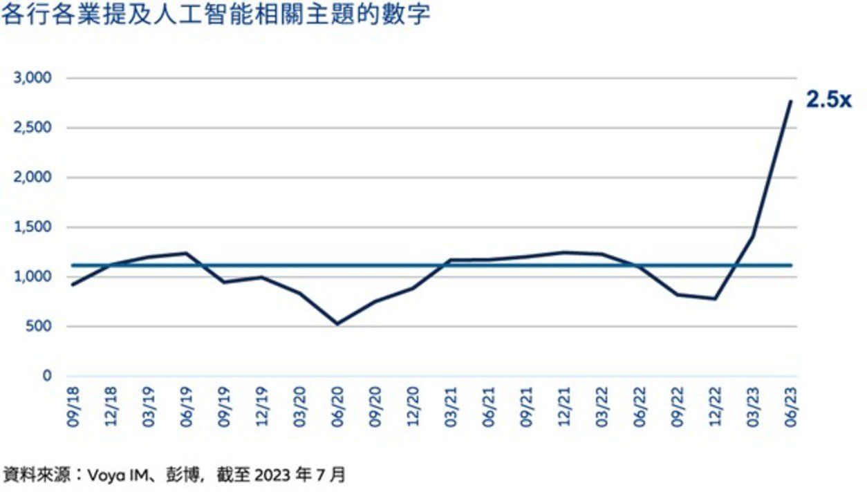 自從 OpenAI 在 2022 年底推出大型語言模型 ChatGPT 之後,企業在季度業績電話會議上提及人工智能及相關主題的情況有所改變。截至 2023 年 6 月 30 日的 3 個月裡(包括第一季業績公布期),整體企業提及人工智能相關主題的次數較 5 年平均水平增加近 2.5 倍。