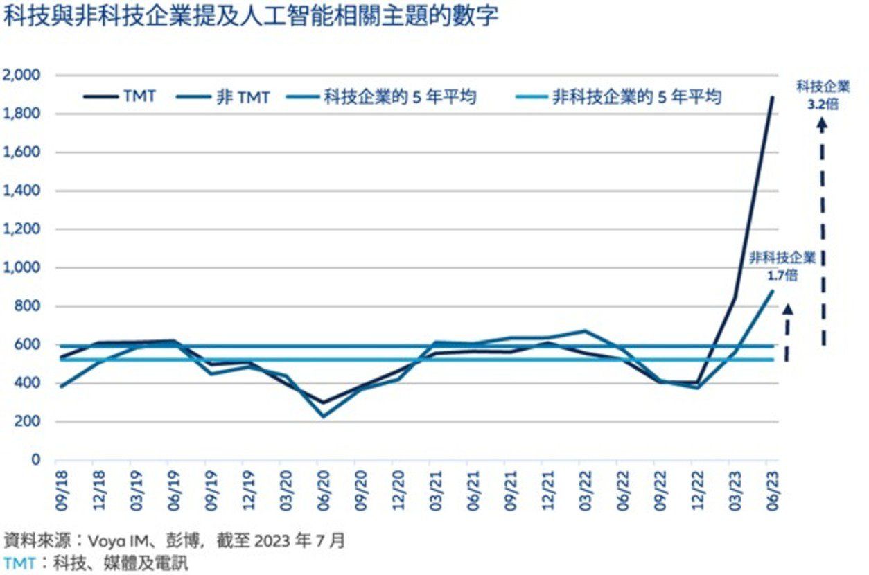 到目前為止,科技公司對人工智能最新發展的看法更加直言不諱,在季度電話會議上提及的次數,較 5 年平均水平增加 3.2 倍。與此同時,即使程度與科技企業不同,但是非科技企業提及人工智能的次數亦有所增加。