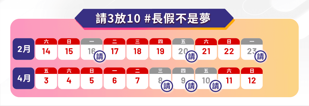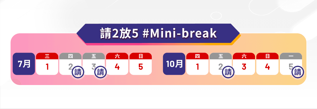 如果3、4日短假唔夠,只要喺特定日子請1-2日AL,就可以將假期延長到5日!最適合一場短途旅遊,可以玩得深入啲,又唔會太攰,絕對係CP值高嘅選擇!