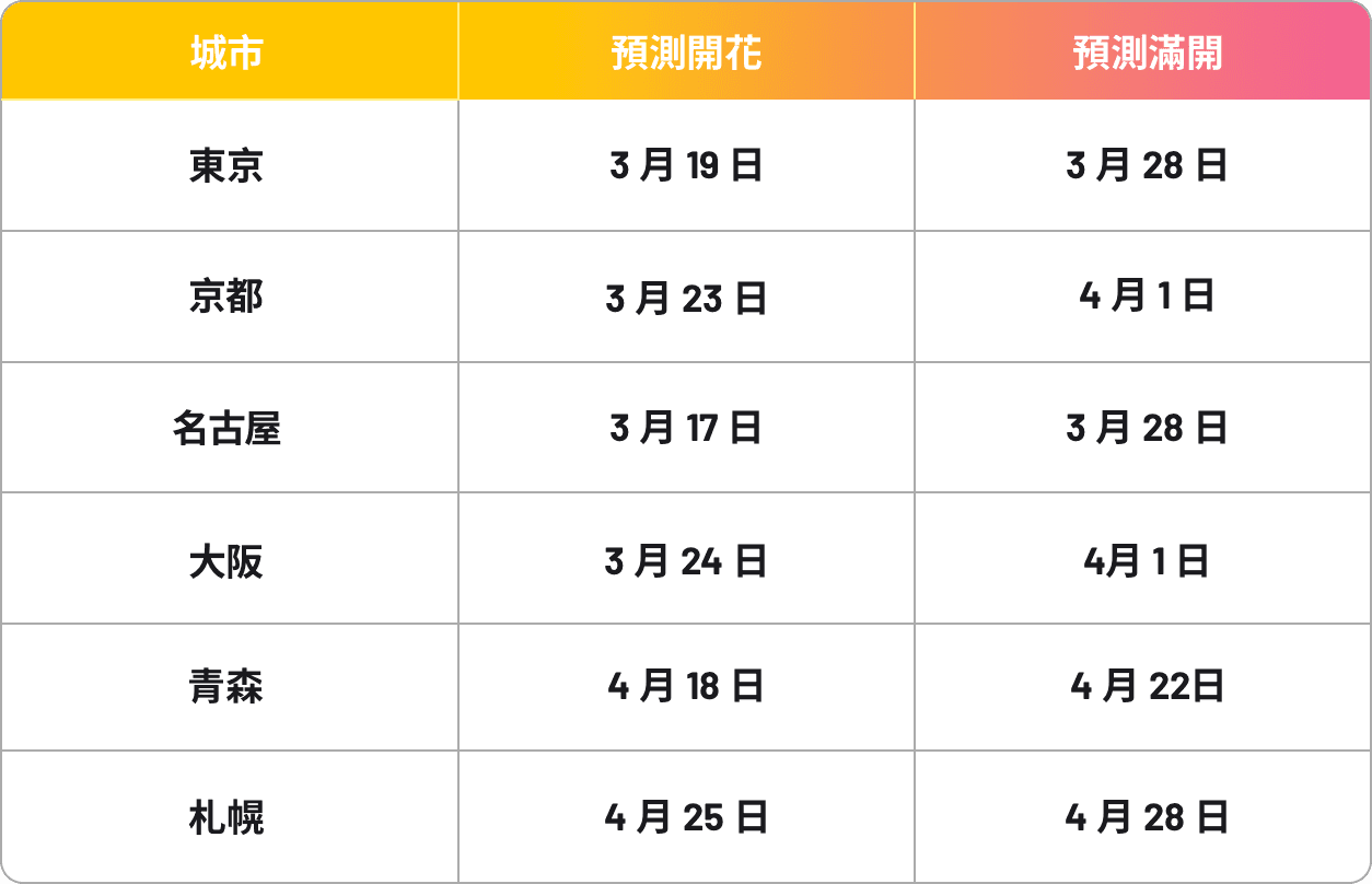 💡小提醒:「開花(Kaika)」與「滿開(Mankai)」日只供參考,實際花期仍會受短期風、雨、溫度波動影響,建議每個城市預留 2–3 晚彈性,以提高「撞正滿開」嘅機會。