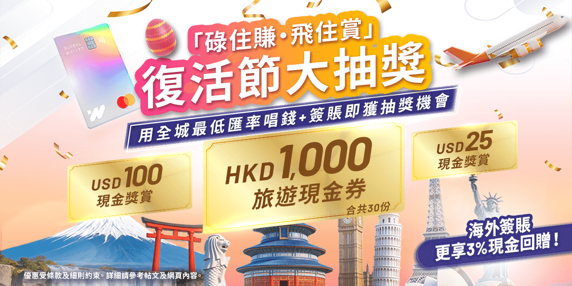 無論去飛、 去玩 、定去掃貨,用WeLab 全城最低匯率1・成本價2 唱定錢,再用WeLab Global Wallet 扣賬卡簽賬享$0外幣交易手續費3 同高達 3%海外簽賬現金回贈4。 每筆消費幫你賺到盡,仲有「碌住賺・飛住賞復活節大抽獎」,分分鐘贏HKD1,000旅遊現金券5,總共有300份豐富獎賞等緊你!🎰