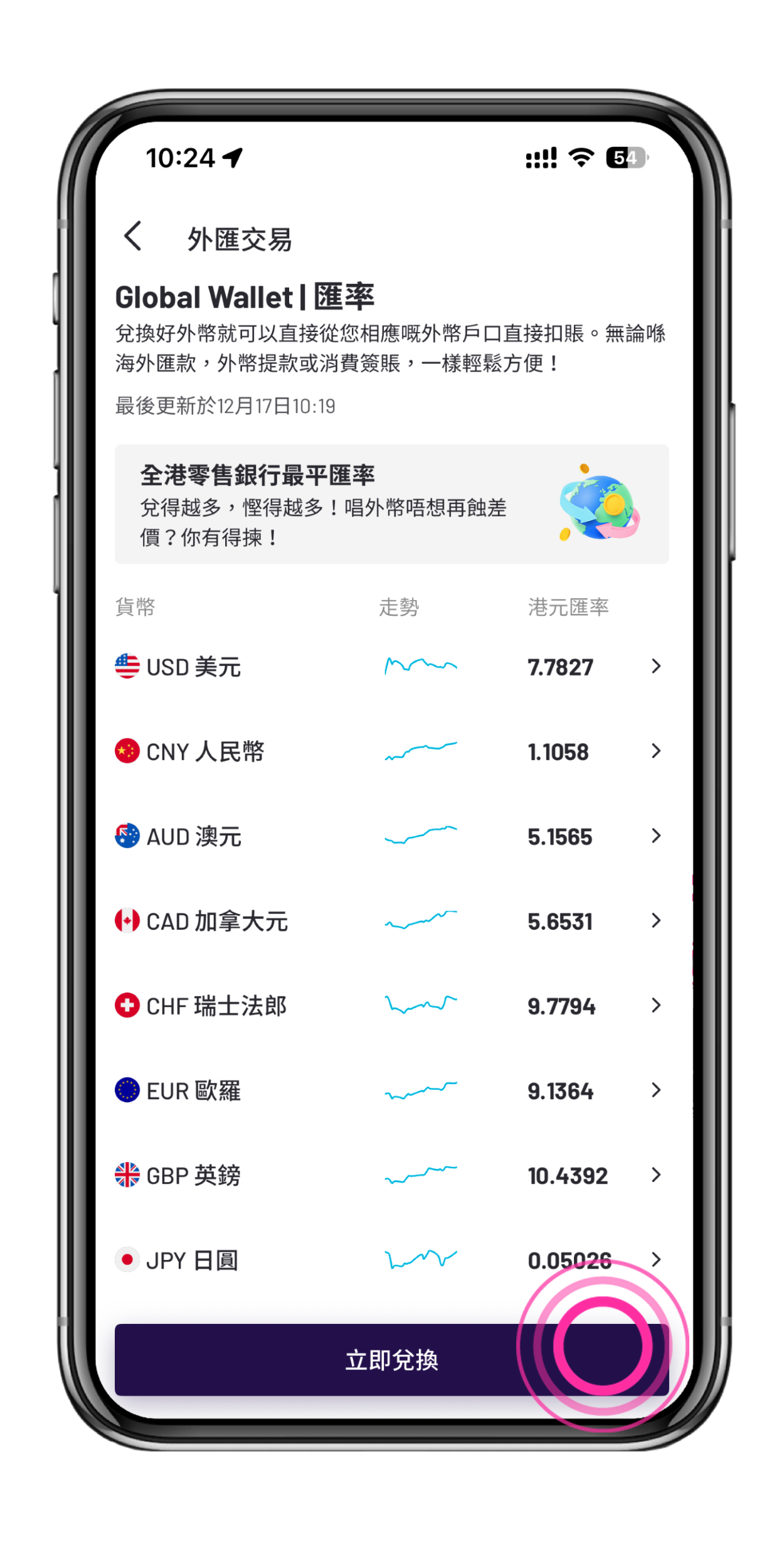 1 全城最低匯率根據2025年9月24日下午3時30分左右於28間零售銀行的網站、網上銀行或流動理財獲取的匯率進行比較 (不包括未有於上述渠道提供匯率的銀行)。有關匯率並不包括任何特別推廣、折扣、優惠、會員計劃及任何其他優惠匯率 (包括但不限於大額兌換折扣),但已包含任何銀行於進行外匯交易時收取的任何費用,以便進行比較。受條款及細則約束,詳情請參閱此處。