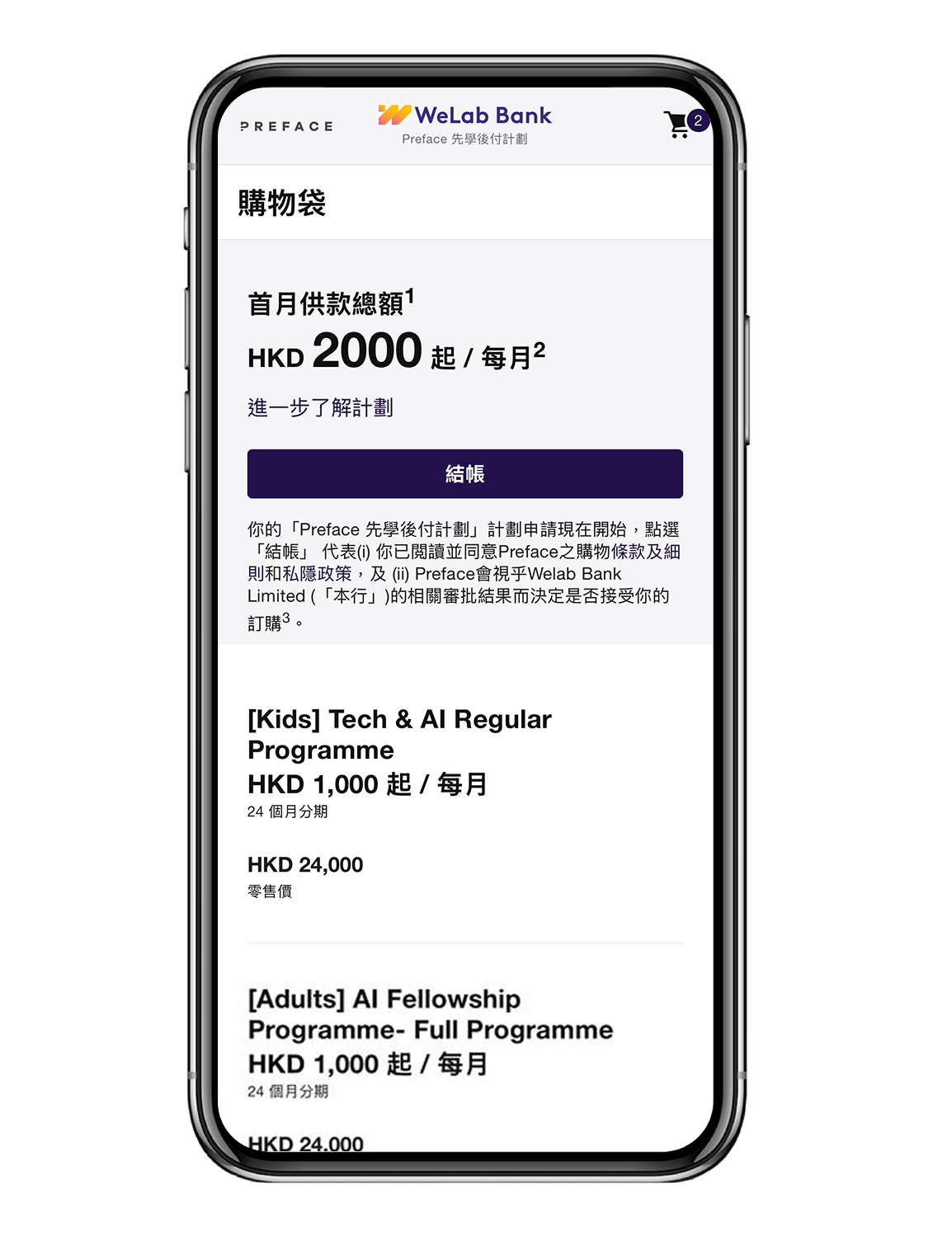 - 每人可享高達 HKD 48,000 循環貸款信用額度3,適用於購買指定成人或小童Preface AI 課程