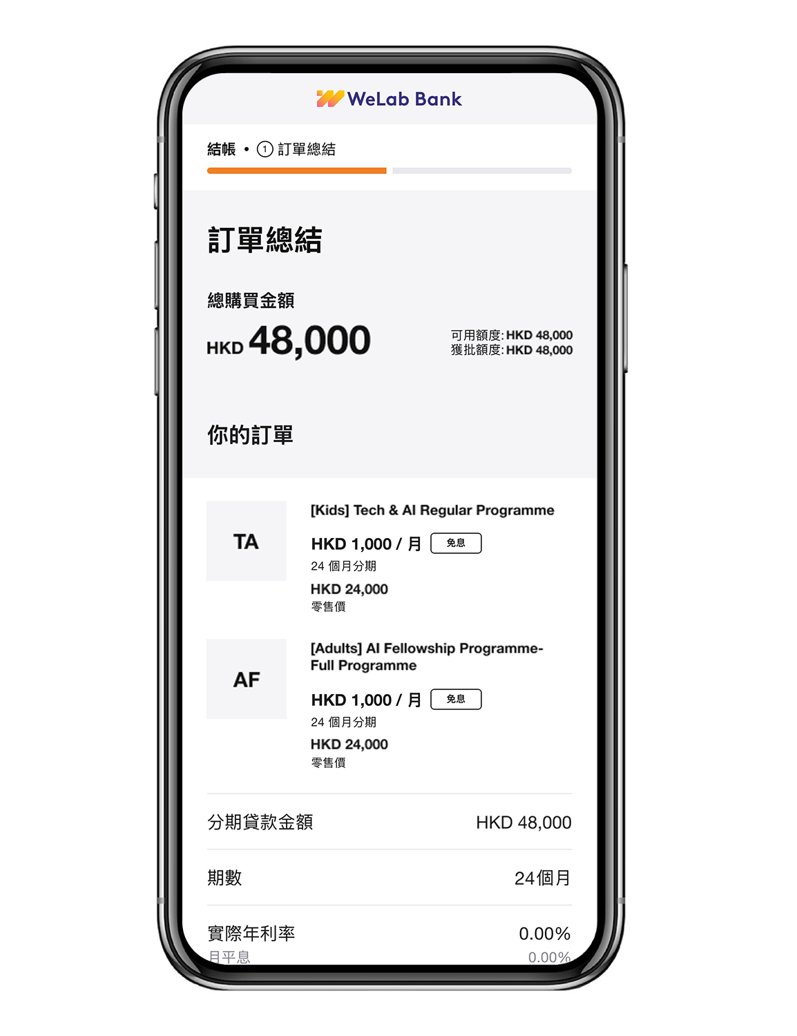 (3) 本計劃之實際年利率為0%。實際年利率乃根據銀行營運守則之指引計算,並已被約至小數後兩個位及或跟隨個別客戶而有差異。實際年利率是一個參考利率,以年化利率展示出已包括所有適用的利率、手續費及收費,適用於個別客戶的實際年利率及每月還款額或有差異,分期計劃之循環貸款信用額、實際年利率及還款期以本行的最終批核為準。如你於申請本計劃前並無有效的WeLab Bank賬戶,你將於申請本計劃時同時申請開立WeLab Bank賬戶。申請完成後,請盡快下載並登入WeLab Bank App以重新驗證你的賬戶並完成設定。在完成重新認證前,你將不能完全使用賬戶的所有功能包括使用循環信用額度進行下一次選購。