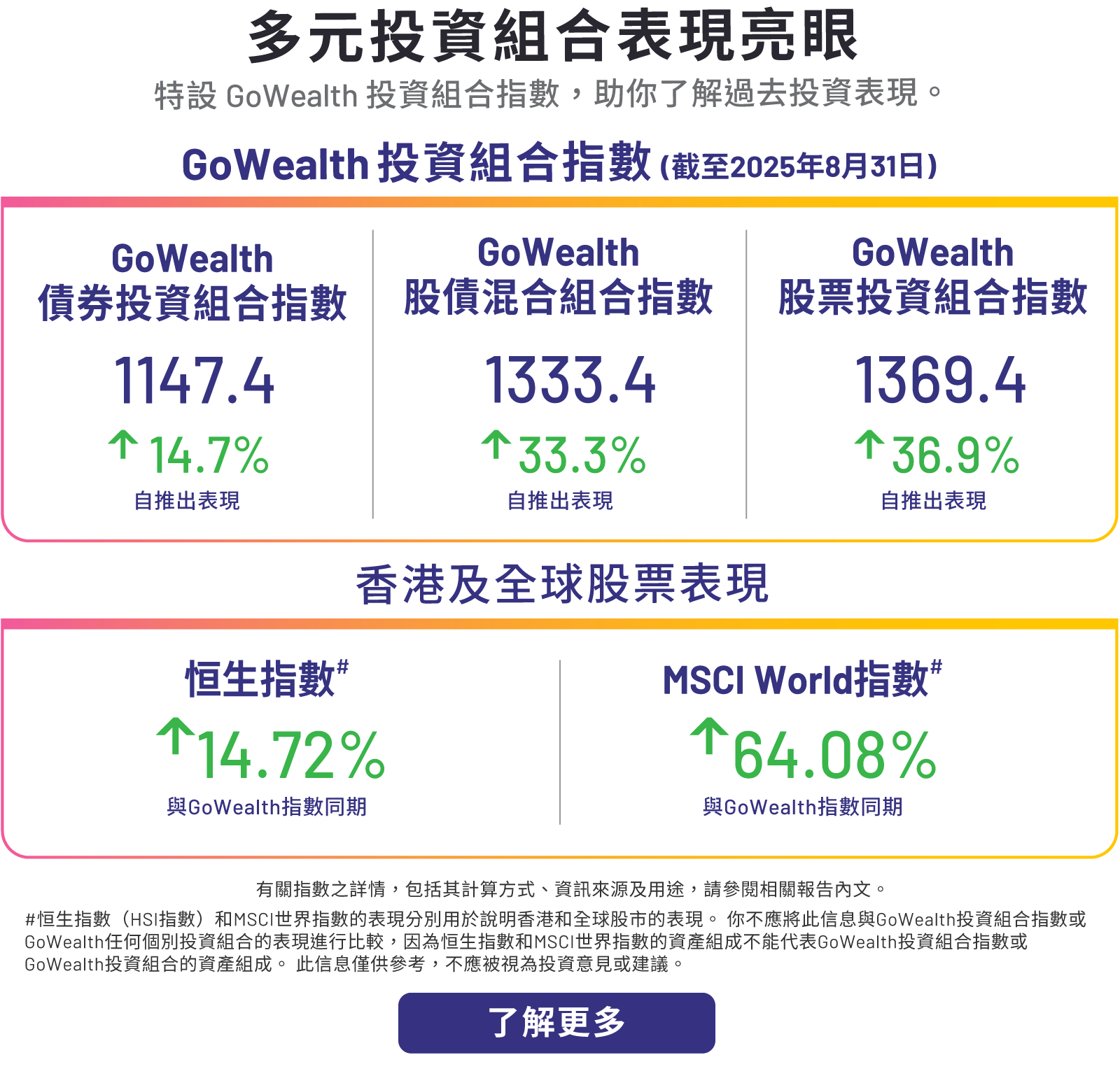 注意: 我們分別就GoWealth的債券組合、股債混合組合及股票組合制定GoWealth投資組合指數,用以反映GoWealth投資組合自推出以來之投資表現。指數僅供參考,且不構成任何投資產品或服務的要約、招攬、建議、意見或任何保證。投資涉及風險。過往業績並不代表將來表現,你不應視指數為未來表現之預測或保證。