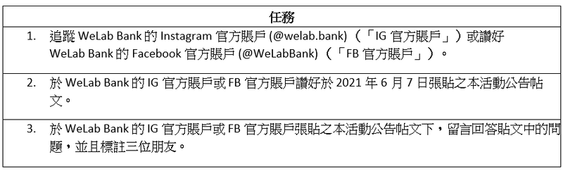 6. 每次抽獎後,我們將按照以上第3條所述之相關抽獎結果公佈時間於WeLab Bank的IG官方賬戶及 FB官方賬戶限時動態內公布得獎者。若你被選為得獎者,即代表你知悉並同意 WeLab Bank將你的 Instagram用戶名或Facebook 用戶名在WeLab Bank IG官方賬戶及 FB官方賬戶限時動態內公開。