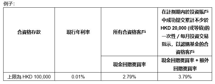 (c) 如你在計劃期內於投資賬戶中成功提交累計不少於HKD 20,000 (或等值)的一次性投資交易指示及/或每月投資交易指示,以認購基金,你將可獲得除現金回贈年利率外的1%的額外回贈獎賞率。