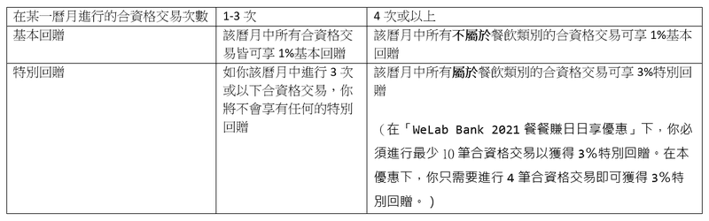 [5] 本優惠為「WeLab Bank 2021餐餐賺日日享優惠」的額外特選優惠,因此本優惠不可與「WeLab Bank 2021餐餐賺日日享優惠」同時使用。