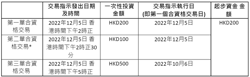 [5] 起步資金金額將等於所有在第一個合資格交易日內進行的合資格交易當中最高一次性投資之金額(「起步資金認購交易」) ,上限為HKD300。「第一個合資格交易日」為你於推廣期內,第一單成功執行的合資格交易之交易日。
