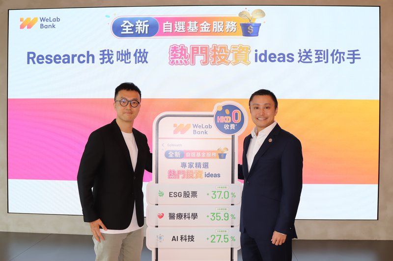 WeLab Bank行政總裁李家達 (左)及WeLab 創辦人及集團行政總裁龍沛智 (右)認為全新推出的自選基金服務能讓客戶 進行投資決策時可以更輕鬆自在。