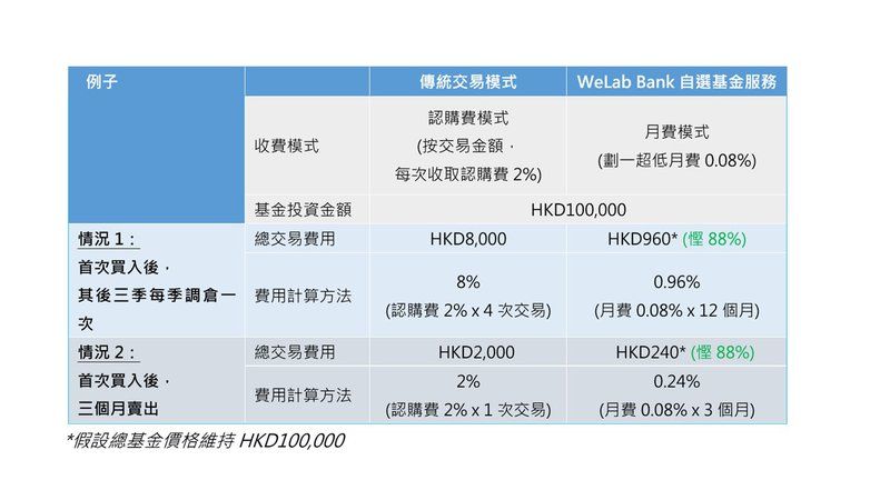 WeLab Bank留意到很多有基金投資經驗的客戶反映,在傳統基金交易模式下,基金產品花多眼亂,難以取得專業建議,加上準備工作繁複和認購費高昂,所以一直期望市場上有新產品改寫現時的既定模式。因此,WeLab Bank 針對這客群推出全新服務,務求令客戶做投資決定時能更輕鬆自在。WeLab Bank為客戶整合專業分析,並因應市況定期送上當下最熱門投資靈感和基金選擇,提供靈活自主的投資方式。此外,自選基金服務巔覆市場現有的逐次收費模式,採用月費模式,方便客戶按市況隨心調整投資組合之餘,亦不會產生額外費用。基金投資客戶轉用WeLab Bank自選基金服務即可比傳統模式節省近 90% 交易費用1!